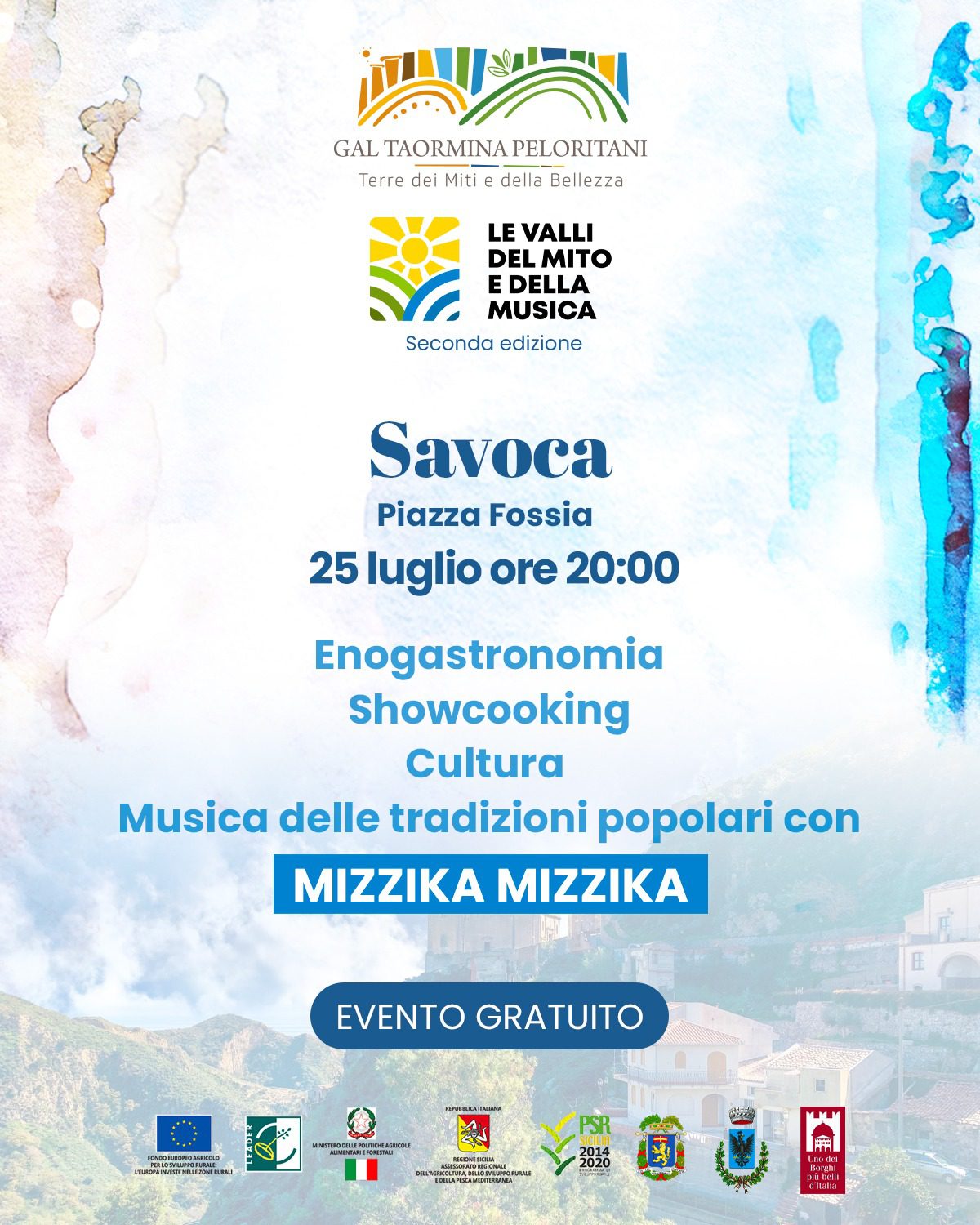 Oggi, 25 luglio, in Piazza Fossia a savoca, con inizio alle ore 20.00, si terrà una delle tappe previste per la manifestazione "le Valli del Mito e della Musica". Attività previste: Enogastronomia, Showcooking, cultura, musica delle tradizioni popolari con i "Mizzika Mizzika".