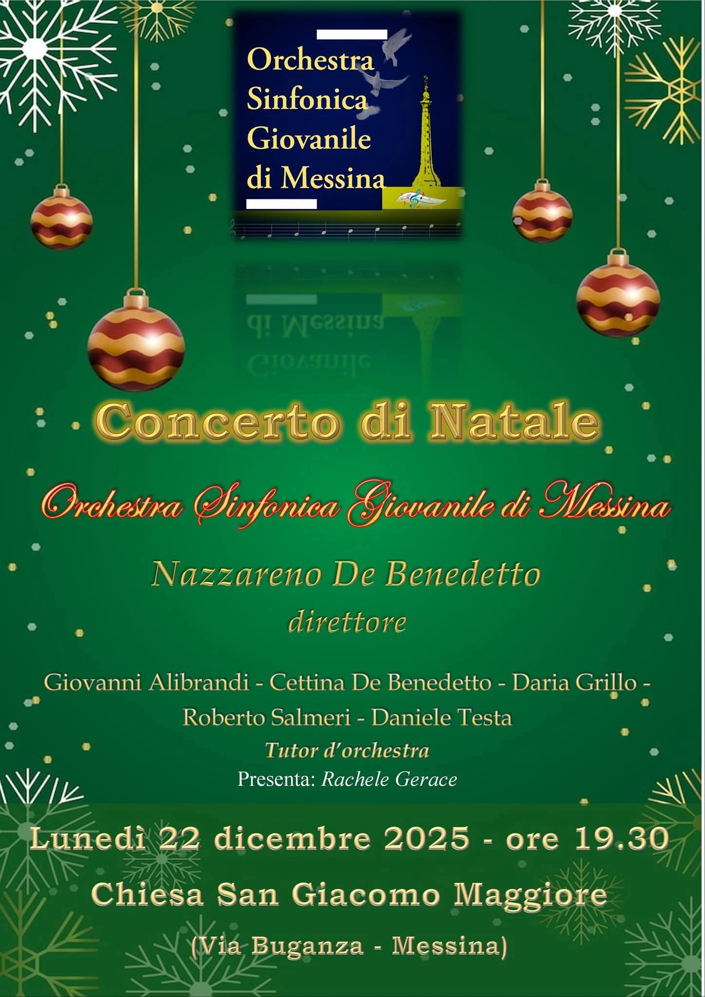 Oggi, 22 dicembre 2025, presso la Chiesa di S. Giacomo Maggiore (Via Buganza - Messina), alle ore 19.30, si potrà assistere al "Concerto di Natale", con l'Orchestra Sinfonica Giovanile di Messina, diretta dal M° Nazzareno De Benedetto.