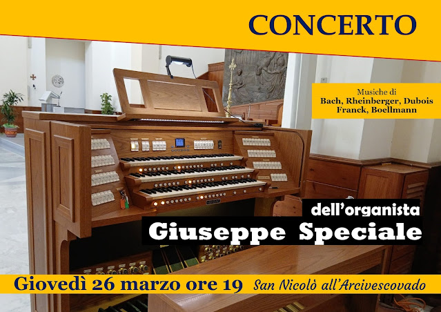 Oggi, 26 marzo 2026, alle ore 19,00, presso la chiesa di S. Nicolò all'Arcivescovado, si potrà assistere alla performance musicale dell'organista Giuseppe Speciale che eseguirà musiche di Bach, Rheinberger, Dubois, Frank e Boellmann.