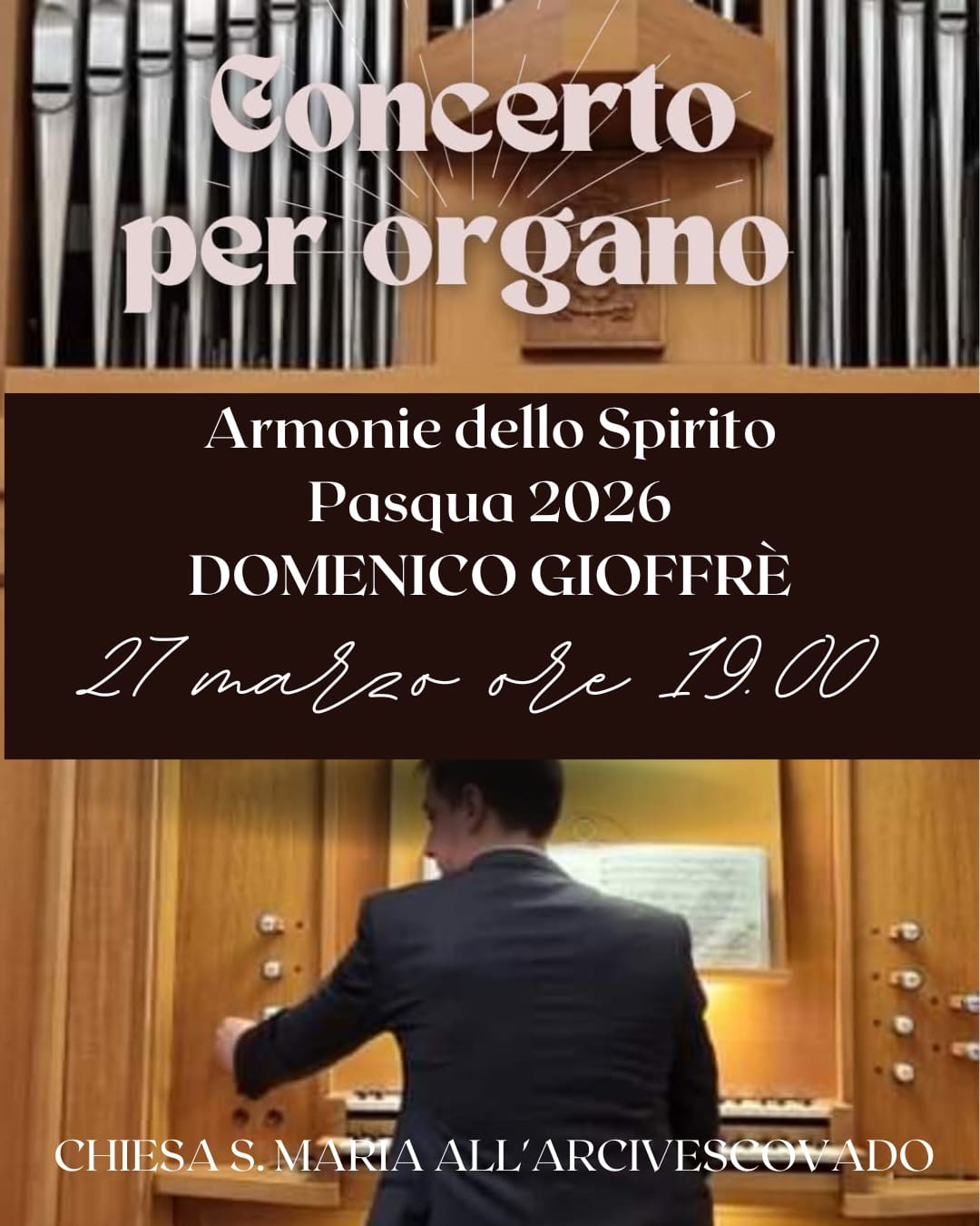 Nell'ambito della rassegna Armonie dello Spirito - Pasqua 2026, domani, venerdì 27 marzo 2026, alle ore 19,00 nella Chiesa di S. Maria all'Arcivescovado, si potrà assistere al concerto per organo del M° Domenico Gioffrè.