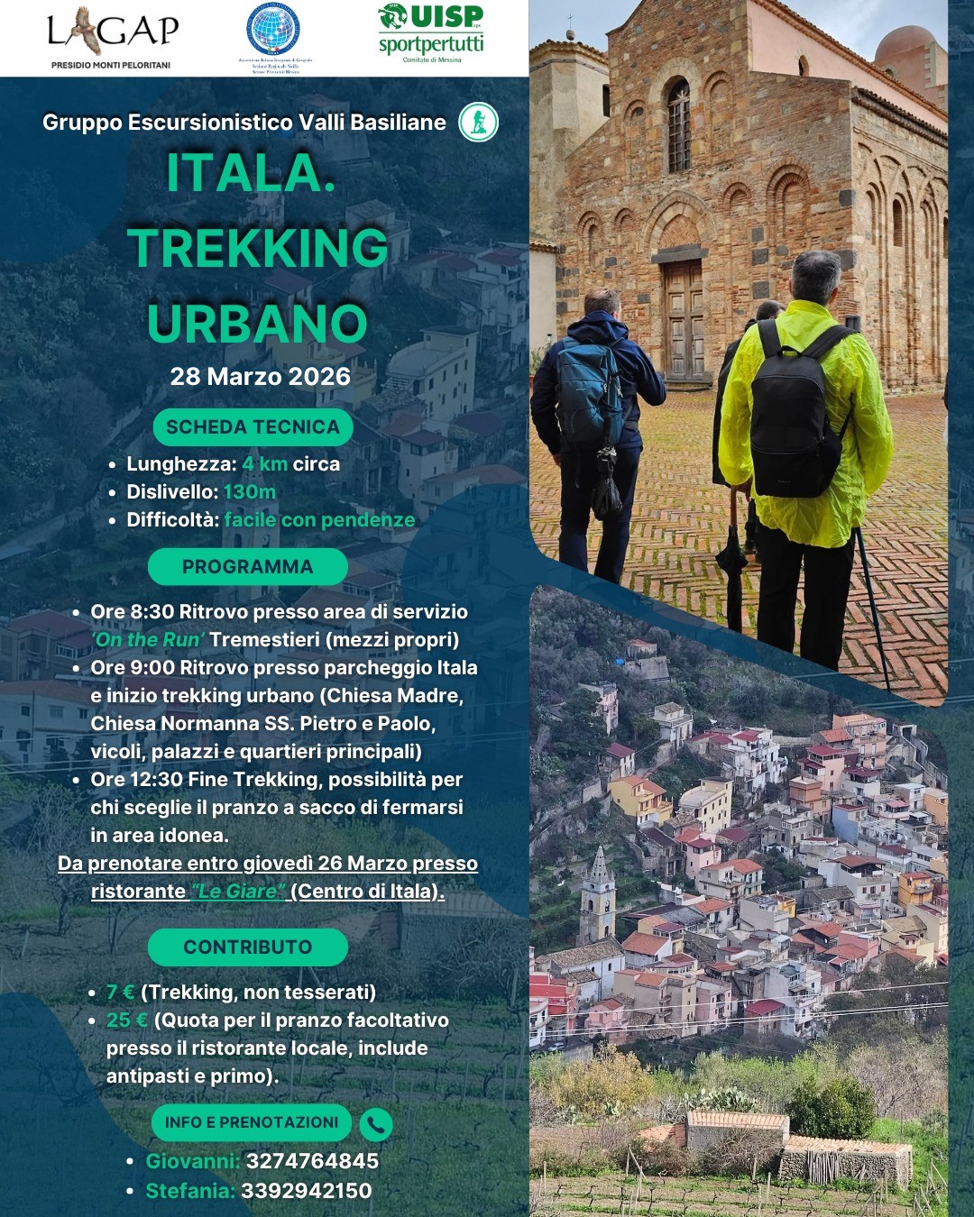 il Gruppo Escursionistico Valli Basiliane ha organizzato per sabato, 28 marzo 2026, un trekking urbano ad Itala durante il quale si potranno visitare alcuni siti culturali del territorio. L'appuntamento è previsto alle ore 8.30 presso la stazione di servizio On the Run di Tremestieri, previsto al termine un pranzo al sacco oppure, su prenotazione, pranzo al ristorante "Le Giare" al centro di Itala.